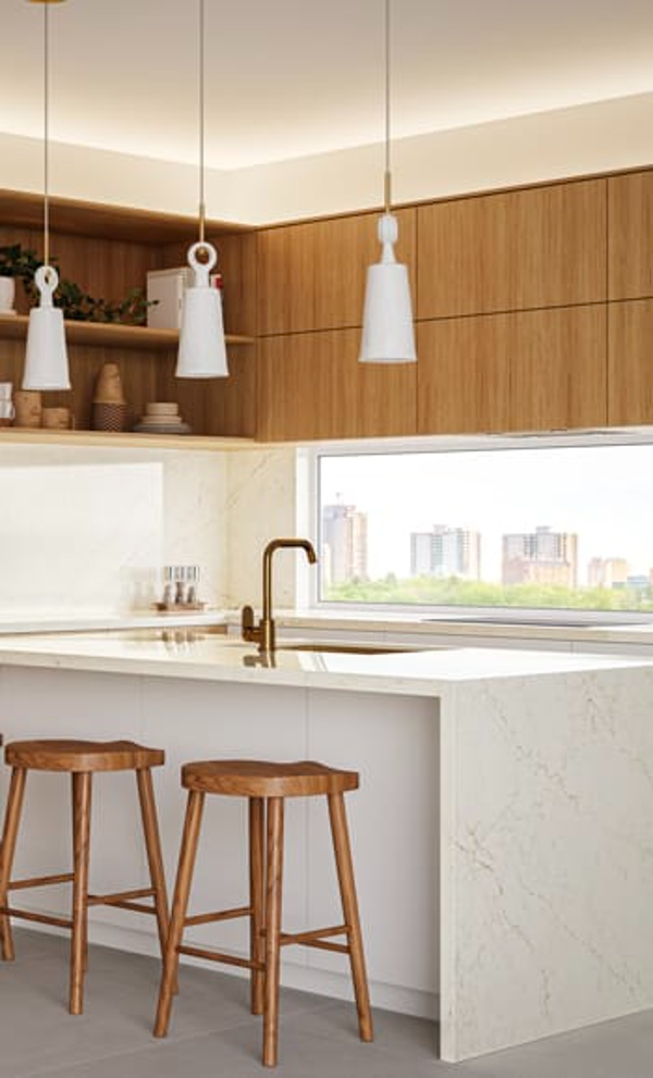 5144 Rossa NovaBase blanc cassé avec des accents dorés profonds et un comptoir en quartz