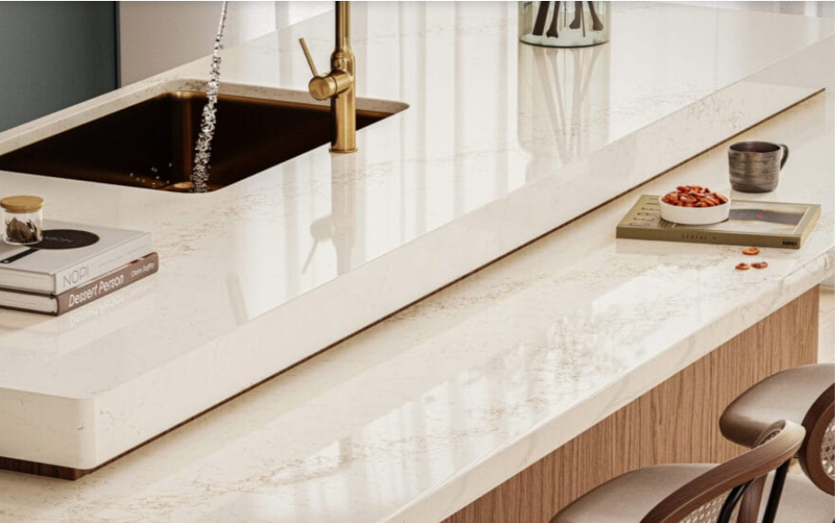 Un fond blanc crème parsemé d’une superposition veineuse de gris, de bruns terreux et de sous-tons verts, s’étendant dans toutes les directions comme une toile organique, crépitant autour de fines fissures d’une énergie primordiale qui se transforma en opulence moderne.